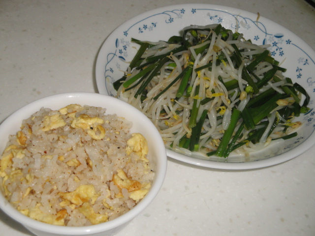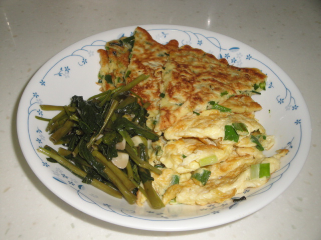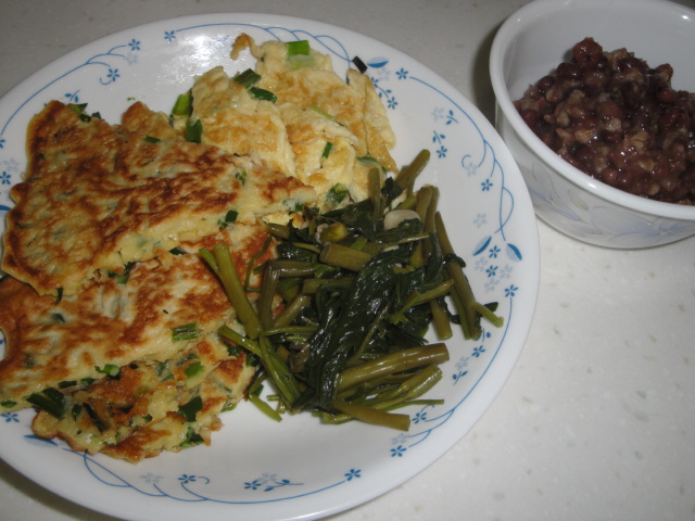 晚餐:跟午餐一模一樣的煎蛋空心菜+煎餅+紅豆薏仁燕麥粥