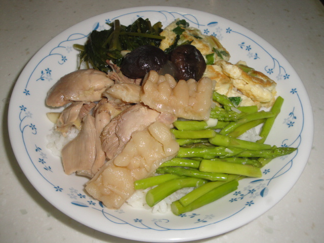 午餐:苦瓜香菇雞+蘆筍+空心菜+炒蛋+飯1碗